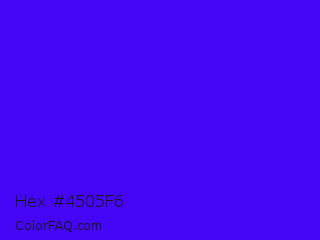Hex #4505f6 Color is a normal indigo color and the nearest color is Electric Ultramarine #3f00ff. Hex code #4505f6 and RGB value is rgb(69,5,246). In RGB color space, this color is composed of 27% red, 2% green, 96% blue, In CMYK color space, this color is composed of 72% cyan, 98% magenta, 0% yellow , 4% black , In HSL color space, this color has a hue angle of 256° , 96% saturation and 49% lightness.
