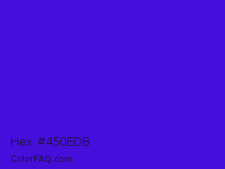 Hex #450edb Color is a normal indigo color and the nearest color is Interdimensional Blue #360ccc. Hex code #450edb and RGB value is rgb(69,14,219). In RGB color space, this color is composed of 27% red, 5% green, 86% blue, In CMYK color space, this color is composed of 68% cyan, 94% magenta, 0% yellow , 14% black , In HSL color space, this color has a hue angle of 256° , 88% saturation and 46% lightness.