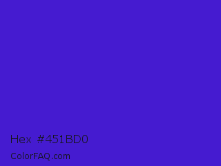 Hex #451bd0 Color is a normal indigo color and the nearest color is Interdimensional Blue #360ccc. Hex code #451bd0 and RGB value is rgb(69,27,208). In RGB color space, this color is composed of 27% red, 11% green, 82% blue, In CMYK color space, this color is composed of 67% cyan, 87% magenta, 0% yellow , 18% black , In HSL color space, this color has a hue angle of 254° , 77% saturation and 46% lightness.
