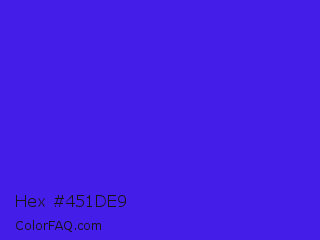 Hex #451de9 Color is a normal indigo color and the nearest color is Han Purple #5218fa. Hex code #451de9 and RGB value is rgb(69,29,233). In RGB color space, this color is composed of 27% red, 11% green, 91% blue, In CMYK color space, this color is composed of 70% cyan, 88% magenta, 0% yellow , 9% black , In HSL color space, this color has a hue angle of 252° , 82% saturation and 51% lightness.