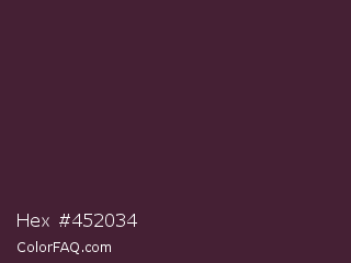 Hex #452034 Color is a very dark rose color and the nearest color is Livid Brown #4d282e. Hex code #452034 and RGB value is rgb(69,32,52). In RGB color space, this color is composed of 27% red, 13% green, 20% blue, In CMYK color space, this color is composed of 0% cyan, 54% magenta, 25% yellow , 73% black , In HSL color space, this color has a hue angle of 328° , 37% saturation and 20% lightness.