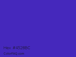 Hex #4528bc Color is a normal indigo color and the nearest color is Ocean Blue #4f42b5. Hex code #4528bc and RGB value is rgb(69,40,188). In RGB color space, this color is composed of 27% red, 16% green, 74% blue, In CMYK color space, this color is composed of 63% cyan, 79% magenta, 0% yellow , 26% black , In HSL color space, this color has a hue angle of 252° , 65% saturation and 45% lightness.