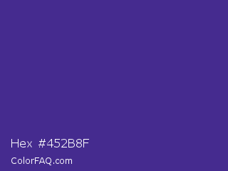 Hex #452b8f Color is a normal indigo color and the nearest color is KSU Purple #512888. Hex code #452b8f and RGB value is rgb(69,43,143). In RGB color space, this color is composed of 27% red, 17% green, 56% blue, In CMYK color space, this color is composed of 52% cyan, 70% magenta, 0% yellow , 44% black , In HSL color space, this color has a hue angle of 256° , 54% saturation and 36% lightness.