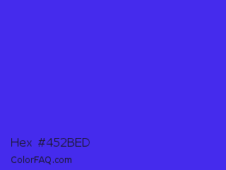 Hex #452bed Color is a normal indigo color and the nearest color is Han Purple #5218fa. Hex code #452bed and RGB value is rgb(69,43,237). In RGB color space, this color is composed of 27% red, 17% green, 93% blue, In CMYK color space, this color is composed of 71% cyan, 82% magenta, 0% yellow , 7% black , In HSL color space, this color has a hue angle of 248° , 84% saturation and 55% lightness.