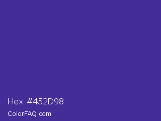 Hex #452d98 Color is a normal indigo color and the nearest color is Daisy Bush #4f2398. Hex code #452d98 and RGB value is rgb(69,45,152). In RGB color space, this color is composed of 27% red, 18% green, 60% blue, In CMYK color space, this color is composed of 55% cyan, 70% magenta, 0% yellow , 40% black , In HSL color space, this color has a hue angle of 253° , 54% saturation and 39% lightness.