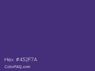 Hex #452f7a Color is a normal indigo color and the nearest color is Minsk #3f307f. Hex code #452f7a and RGB value is rgb(69,47,122). In RGB color space, this color is composed of 27% red, 18% green, 48% blue, In CMYK color space, this color is composed of 43% cyan, 61% magenta, 0% yellow , 52% black , In HSL color space, this color has a hue angle of 258° , 44% saturation and 33% lightness.