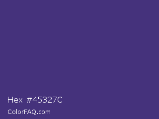 Hex #45327c Color is a normal indigo color and the nearest color is Minsk #3f307f. Hex code #45327c and RGB value is rgb(69,50,124). In RGB color space, this color is composed of 27% red, 20% green, 49% blue, In CMYK color space, this color is composed of 44% cyan, 60% magenta, 0% yellow , 51% black , In HSL color space, this color has a hue angle of 255° , 43% saturation and 34% lightness.