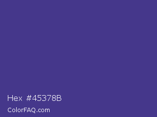 Hex #45378b Color is a normal indigo color and the nearest color is Dark Slate Blue #483d8b. Hex code #45378b and RGB value is rgb(69,55,139). In RGB color space, this color is composed of 27% red, 22% green, 55% blue, In CMYK color space, this color is composed of 50% cyan, 60% magenta, 0% yellow , 45% black , In HSL color space, this color has a hue angle of 250° , 43% saturation and 38% lightness.