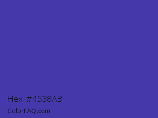 Hex #4538ab Color is a normal indigo color and the nearest color is Ocean Blue #4f42b5. Hex code #4538ab and RGB value is rgb(69,56,171). In RGB color space, this color is composed of 27% red, 22% green, 67% blue, In CMYK color space, this color is composed of 60% cyan, 67% magenta, 0% yellow , 33% black , In HSL color space, this color has a hue angle of 247° , 51% saturation and 45% lightness.