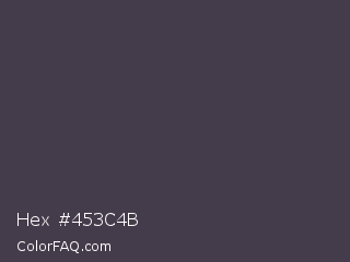 Hex #453c4b Color is a dark purple color and the nearest color is Gravel #4a444b. Hex code #453c4b and RGB value is rgb(69,60,75). In RGB color space, this color is composed of 27% red, 24% green, 29% blue, In CMYK color space, this color is composed of 8% cyan, 20% magenta, 0% yellow , 71% black , In HSL color space, this color has a hue angle of 276° , 11% saturation and 26% lightness.
