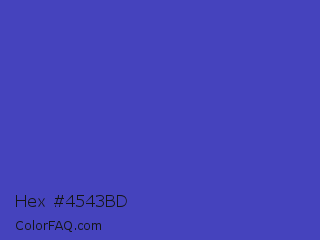 Hex #4543bd Color is a normal indigo color and the nearest color is Ocean Blue #4f42b5. Hex code #4543bd and RGB value is rgb(69,67,189). In RGB color space, this color is composed of 27% red, 26% green, 74% blue, In CMYK color space, this color is composed of 63% cyan, 65% magenta, 0% yellow , 26% black , In HSL color space, this color has a hue angle of 241° , 48% saturation and 50% lightness.