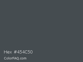 Hex #454c50 Color is a dark blue color and the nearest color is Mako #444954. Hex code #454c50 and RGB value is rgb(69,76,80). In RGB color space, this color is composed of 27% red, 30% green, 31% blue, In CMYK color space, this color is composed of 14% cyan, 5% magenta, 0% yellow , 69% black , In HSL color space, this color has a hue angle of 202° , 7% saturation and 29% lightness.