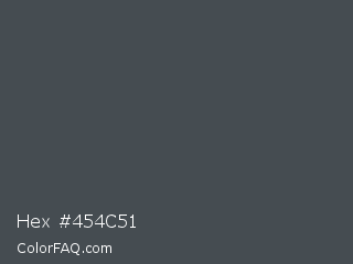 Hex #454c51 Color is a dark blue color and the nearest color is Mako #444954. Hex code #454c51 and RGB value is rgb(69,76,81). In RGB color space, this color is composed of 27% red, 30% green, 32% blue, In CMYK color space, this color is composed of 15% cyan, 6% magenta, 0% yellow , 68% black , In HSL color space, this color has a hue angle of 205° , 8% saturation and 29% lightness.