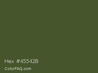 Hex #45542b Color is a dark green color and the nearest color is Woodland #4d5328. Hex code #45542b and RGB value is rgb(69,84,43). In RGB color space, this color is composed of 27% red, 33% green, 17% blue, In CMYK color space, this color is composed of 18% cyan, 0% magenta, 49% yellow , 67% black , In HSL color space, this color has a hue angle of 82° , 32% saturation and 25% lightness.