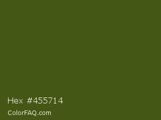 Hex #455714 Color is a very dark lime color and the nearest color is Army Green #4b5320. Hex code #455714 and RGB value is rgb(69,87,20). In RGB color space, this color is composed of 27% red, 34% green, 8% blue, In CMYK color space, this color is composed of 21% cyan, 0% magenta, 77% yellow , 66% black , In HSL color space, this color has a hue angle of 76° , 63% saturation and 21% lightness.