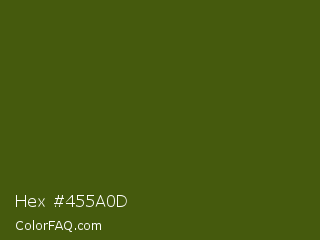 Hex #455a0d Color is a very dark lime color and the nearest color is Verdun Green #495400. Hex code #455a0d and RGB value is rgb(69,90,13). In RGB color space, this color is composed of 27% red, 35% green, 5% blue, In CMYK color space, this color is composed of 23% cyan, 0% magenta, 86% yellow , 65% black , In HSL color space, this color has a hue angle of 76° , 75% saturation and 20% lightness.