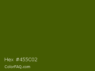 Hex #455c02 Color is a very dark lime color and the nearest color is Verdun Green #495400. Hex code #455c02 and RGB value is rgb(69,92,2). In RGB color space, this color is composed of 27% red, 36% green, 1% blue, In CMYK color space, this color is composed of 25% cyan, 0% magenta, 98% yellow , 64% black , In HSL color space, this color has a hue angle of 75° , 96% saturation and 18% lightness.