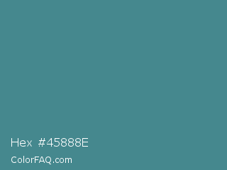 Hex #45888e Color is a normal cyan color and the nearest color is Smalt Blue #51808f. Hex code #45888e and RGB value is rgb(69,136,142). In RGB color space, this color is composed of 27% red, 53% green, 56% blue, In CMYK color space, this color is composed of 51% cyan, 4% magenta, 0% yellow , 44% black , In HSL color space, this color has a hue angle of 185° , 35% saturation and 41% lightness.