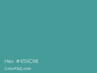 Hex #459c98 Color is a normal cyan color and the nearest color is Zomp #39a78e. Hex code #459c98 and RGB value is rgb(69,156,152). In RGB color space, this color is composed of 27% red, 61% green, 60% blue, In CMYK color space, this color is composed of 56% cyan, 0% magenta, 3% yellow , 39% black , In HSL color space, this color has a hue angle of 177° , 39% saturation and 44% lightness.