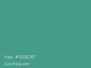 Hex #459d87 Color is a normal cyan color and the nearest color is Zomp #39a78e. Hex code #459d87 and RGB value is rgb(69,157,135). In RGB color space, this color is composed of 27% red, 62% green, 53% blue, In CMYK color space, this color is composed of 56% cyan, 0% magenta, 14% yellow , 38% black , In HSL color space, this color has a hue angle of 165° , 39% saturation and 44% lightness.