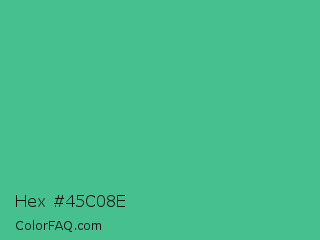 Hex #45c08e Color is a normal green color and the nearest color is Ocean Green #48bf91. Hex code #45c08e and RGB value is rgb(69,192,142). In RGB color space, this color is composed of 27% red, 75% green, 56% blue, In CMYK color space, this color is composed of 64% cyan, 0% magenta, 26% yellow , 25% black , In HSL color space, this color has a hue angle of 156° , 49% saturation and 51% lightness.