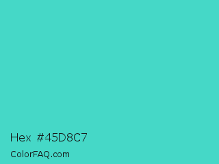 Hex #45d8c7 Color is a normal cyan color and the nearest color is Medium Turquoise #48d1cc. Hex code #45d8c7 and RGB value is rgb(69,216,199). In RGB color space, this color is composed of 27% red, 85% green, 78% blue, In CMYK color space, this color is composed of 68% cyan, 0% magenta, 8% yellow , 15% black , In HSL color space, this color has a hue angle of 173° , 65% saturation and 56% lightness.