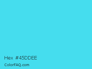 Hex #45ddee Color is a normal cyan color and the nearest color is Turquoise #40e0d0. Hex code #45ddee and RGB value is rgb(69,221,238). In RGB color space, this color is composed of 27% red, 87% green, 93% blue, In CMYK color space, this color is composed of 71% cyan, 7% magenta, 0% yellow , 7% black , In HSL color space, this color has a hue angle of 186° , 83% saturation and 60% lightness.