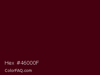Hex #46000f Color is a very dark red color and the nearest color is Bulgarian Rose #480607. Hex code #46000f and RGB value is rgb(70,0,15). In RGB color space, this color is composed of 27% red, 0% green, 6% blue, In CMYK color space, this color is composed of 0% cyan, 100% magenta, 79% yellow , 73% black , In HSL color space, this color has a hue angle of 347° , 100% saturation and 14% lightness.