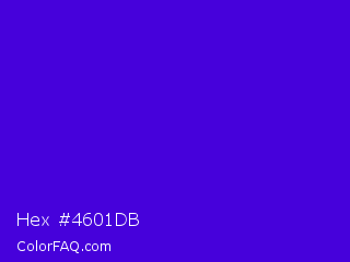 Hex #4601db Color is a normal indigo color and the nearest color is Interdimensional Blue #360ccc. Hex code #4601db and RGB value is rgb(70,1,219). In RGB color space, this color is composed of 27% red, 0% green, 86% blue, In CMYK color space, this color is composed of 68% cyan, 100% magenta, 0% yellow , 14% black , In HSL color space, this color has a hue angle of 259° , 99% saturation and 43% lightness.