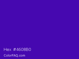 Hex #4608b0 Color is a normal violet color and the nearest color is Interdimensional Blue #360ccc. Hex code #4608b0 and RGB value is rgb(70,8,176). In RGB color space, this color is composed of 27% red, 3% green, 69% blue, In CMYK color space, this color is composed of 60% cyan, 95% magenta, 0% yellow , 31% black , In HSL color space, this color has a hue angle of 262° , 91% saturation and 36% lightness.