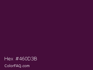 Hex #460d3b Color is a very dark magenta color and the nearest color is Loulou #460b41. Hex code #460d3b and RGB value is rgb(70,13,59). In RGB color space, this color is composed of 27% red, 5% green, 23% blue, In CMYK color space, this color is composed of 0% cyan, 81% magenta, 16% yellow , 73% black , In HSL color space, this color has a hue angle of 312° , 69% saturation and 16% lightness.