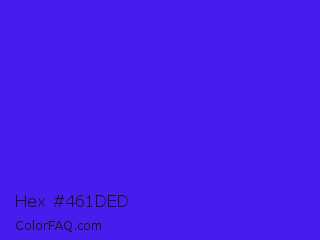 Hex #461ded Color is a normal indigo color and the nearest color is Han Purple #5218fa. Hex code #461ded and RGB value is rgb(70,29,237). In RGB color space, this color is composed of 27% red, 11% green, 93% blue, In CMYK color space, this color is composed of 70% cyan, 88% magenta, 0% yellow , 7% black , In HSL color space, this color has a hue angle of 252° , 85% saturation and 52% lightness.
