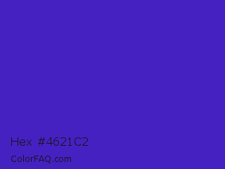 Hex #4621c2 Color is a normal indigo color and the nearest color is Interdimensional Blue #360ccc. Hex code #4621c2 and RGB value is rgb(70,33,194). In RGB color space, this color is composed of 27% red, 13% green, 76% blue, In CMYK color space, this color is composed of 64% cyan, 83% magenta, 0% yellow , 24% black , In HSL color space, this color has a hue angle of 254° , 71% saturation and 45% lightness.