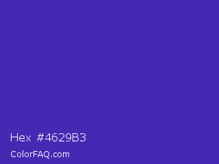 Hex #4629b3 Color is a normal indigo color and the nearest color is Ocean Blue #4f42b5. Hex code #4629b3 and RGB value is rgb(70,41,179). In RGB color space, this color is composed of 27% red, 16% green, 70% blue, In CMYK color space, this color is composed of 61% cyan, 77% magenta, 0% yellow , 30% black , In HSL color space, this color has a hue angle of 253° , 63% saturation and 43% lightness.