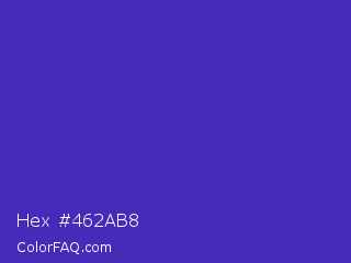 Hex #462ab8 Color is a normal indigo color and the nearest color is Ocean Blue #4f42b5. Hex code #462ab8 and RGB value is rgb(70,42,184). In RGB color space, this color is composed of 27% red, 16% green, 72% blue, In CMYK color space, this color is composed of 62% cyan, 77% magenta, 0% yellow , 28% black , In HSL color space, this color has a hue angle of 252° , 63% saturation and 44% lightness.