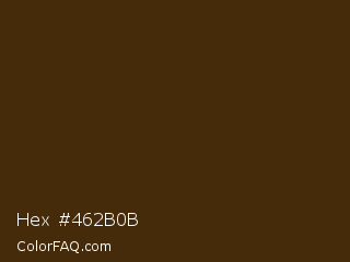 Hex #462b0b Color is a very dark orange color and the nearest color is Bracken #4a2a04. Hex code #462b0b and RGB value is rgb(70,43,11). In RGB color space, this color is composed of 27% red, 17% green, 4% blue, In CMYK color space, this color is composed of 0% cyan, 39% magenta, 84% yellow , 73% black , In HSL color space, this color has a hue angle of 33° , 73% saturation and 16% lightness.