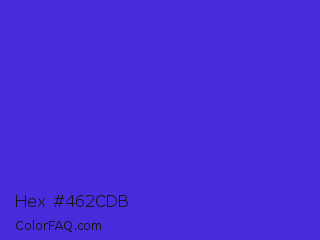 Hex #462cdb Color is a normal indigo color and the nearest color is Palatinate Blue #273be2. Hex code #462cdb and RGB value is rgb(70,44,219). In RGB color space, this color is composed of 27% red, 17% green, 86% blue, In CMYK color space, this color is composed of 68% cyan, 80% magenta, 0% yellow , 14% black , In HSL color space, this color has a hue angle of 249° , 71% saturation and 52% lightness.