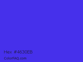 Hex #4630eb Color is a normal indigo color and the nearest color is Han Purple #5218fa. Hex code #4630eb and RGB value is rgb(70,48,235). In RGB color space, this color is composed of 27% red, 19% green, 92% blue, In CMYK color space, this color is composed of 70% cyan, 80% magenta, 0% yellow , 8% black , In HSL color space, this color has a hue angle of 247° , 82% saturation and 55% lightness.