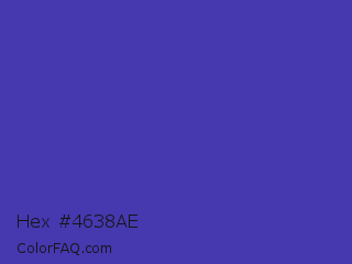 Hex #4638ae Color is a normal indigo color and the nearest color is Ocean Blue #4f42b5. Hex code #4638ae and RGB value is rgb(70,56,174). In RGB color space, this color is composed of 27% red, 22% green, 68% blue, In CMYK color space, this color is composed of 60% cyan, 68% magenta, 0% yellow , 32% black , In HSL color space, this color has a hue angle of 247° , 51% saturation and 45% lightness.