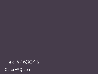Hex #463c4b Color is a dark purple color and the nearest color is Gravel #4a444b. Hex code #463c4b and RGB value is rgb(70,60,75). In RGB color space, this color is composed of 27% red, 24% green, 29% blue, In CMYK color space, this color is composed of 7% cyan, 20% magenta, 0% yellow , 71% black , In HSL color space, this color has a hue angle of 280° , 11% saturation and 26% lightness.