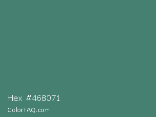 Hex #468071 Color is a normal cyan color and the nearest color is Viridian #40826d. Hex code #468071 and RGB value is rgb(70,128,113). In RGB color space, this color is composed of 27% red, 50% green, 44% blue, In CMYK color space, this color is composed of 45% cyan, 0% magenta, 12% yellow , 50% black , In HSL color space, this color has a hue angle of 164° , 29% saturation and 39% lightness.