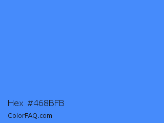 Hex #468bfb Color is a light blue color and the nearest color is Blueberry #4f86f7. Hex code #468bfb and RGB value is rgb(70,139,251). In RGB color space, this color is composed of 27% red, 55% green, 98% blue, In CMYK color space, this color is composed of 72% cyan, 45% magenta, 0% yellow , 2% black , In HSL color space, this color has a hue angle of 217° , 96% saturation and 63% lightness.