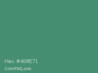 Hex #468e71 Color is a normal green color and the nearest color is Viridian #40826d. Hex code #468e71 and RGB value is rgb(70,142,113). In RGB color space, this color is composed of 27% red, 56% green, 44% blue, In CMYK color space, this color is composed of 51% cyan, 0% magenta, 20% yellow , 44% black , In HSL color space, this color has a hue angle of 156° , 34% saturation and 42% lightness.