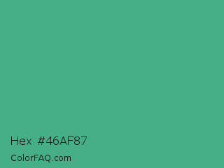 Hex #46af87 Color is a normal green color and the nearest color is Mint #3eb489. Hex code #46af87 and RGB value is rgb(70,175,135). In RGB color space, this color is composed of 27% red, 69% green, 53% blue, In CMYK color space, this color is composed of 60% cyan, 0% magenta, 23% yellow , 31% black , In HSL color space, this color has a hue angle of 157° , 43% saturation and 48% lightness.