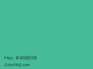 Hex #46bb98 Color is a normal green color and the nearest color is Ocean Green #48bf91. Hex code #46bb98 and RGB value is rgb(70,187,152). In RGB color space, this color is composed of 27% red, 73% green, 60% blue, In CMYK color space, this color is composed of 63% cyan, 0% magenta, 19% yellow , 27% black , In HSL color space, this color has a hue angle of 162° , 46% saturation and 50% lightness.