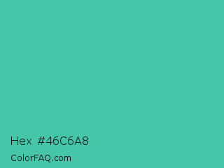 Hex #46c6a8 Color is a normal cyan color and the nearest color is Puerto Rico #3fc1aa. Hex code #46c6a8 and RGB value is rgb(70,198,168). In RGB color space, this color is composed of 27% red, 78% green, 66% blue, In CMYK color space, this color is composed of 65% cyan, 0% magenta, 15% yellow , 22% black , In HSL color space, this color has a hue angle of 166° , 53% saturation and 53% lightness.
