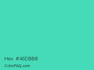 Hex #46dbb8 Color is a normal cyan color and the nearest color is Eucalyptus #44d7a8. Hex code #46dbb8 and RGB value is rgb(70,219,184). In RGB color space, this color is composed of 27% red, 86% green, 72% blue, In CMYK color space, this color is composed of 68% cyan, 0% magenta, 16% yellow , 14% black , In HSL color space, this color has a hue angle of 166° , 67% saturation and 57% lightness.