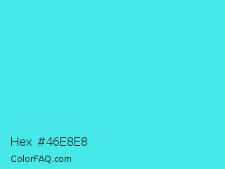 Hex #46e8e8 Color is a normal cyan color and the nearest color is Turquoise #40e0d0. Hex code #46e8e8 and RGB value is rgb(70,232,232). In RGB color space, this color is composed of 27% red, 91% green, 91% blue, In CMYK color space, this color is composed of 70% cyan, 0% magenta, 0% yellow , 9% black , In HSL color space, this color has a hue angle of 180° , 78% saturation and 59% lightness.