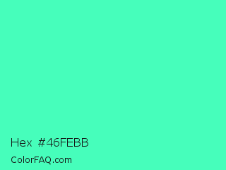 Hex #46febb Color is a light green color and the nearest color is Turquoise #40e0d0. Hex code #46febb and RGB value is rgb(70,254,187). In RGB color space, this color is composed of 27% red, 100% green, 73% blue, In CMYK color space, this color is composed of 72% cyan, 0% magenta, 26% yellow , 0% black , In HSL color space, this color has a hue angle of 158° , 99% saturation and 64% lightness.