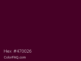 Hex #470026 Color is a very dark rose color and the nearest color is Barossa #44012d. Hex code #470026 and RGB value is rgb(71,0,38). In RGB color space, this color is composed of 28% red, 0% green, 15% blue, In CMYK color space, this color is composed of 0% cyan, 100% magenta, 46% yellow , 72% black , In HSL color space, this color has a hue angle of 328° , 100% saturation and 14% lightness.